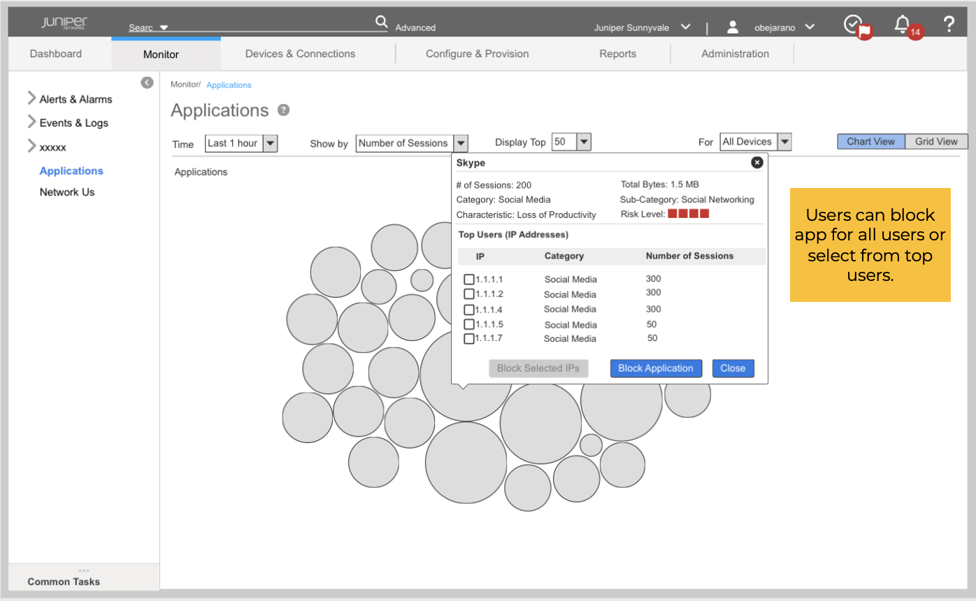 Network Administrators needed to quickly view and troubleshoot networking issues. The current method for traffic monitoring and troubleshooting required vast technical knowledge and expertise in CLI coding in order to understand issues and take action. The Network Traffic feature allowed users to view network traffic from maps, graphs, and grids and then quickly troubleshoot issues by blocking or throttling applications, network users, and source and destination countries . This product was to use AI to edit the policies for users based on their intentions.