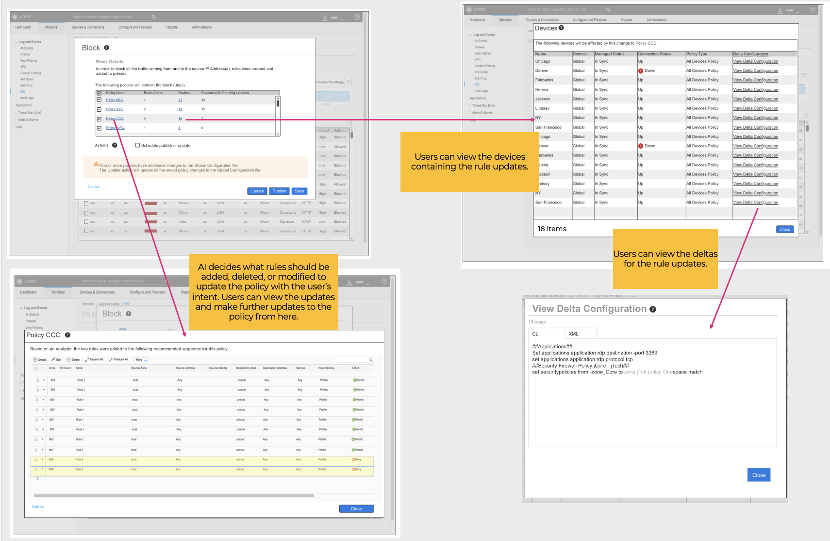 Finally, users could see the rules in the policies which were added, deleted, or edited based on the updated rules. They had the opportunity to make further updates to the policies, view affected devices, and view the updated configurations.